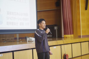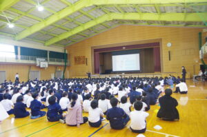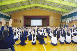 600人を超える児童と、教職員、保護者の方にご参加いただきました。 理学療法士の呼びかけに、挙手や体を動かすなど、児童たちは元気いっぱいに応えてくれました。
