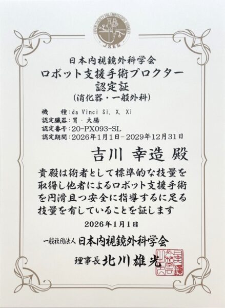 この度、当院、外科医長の吉川幸造医師が、ロボット支援手術における大腸がんの指導医資格(プロクター)に認定されました。